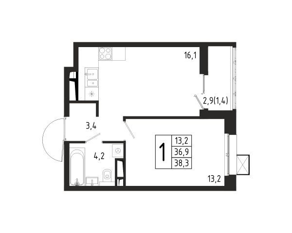 1 комната, 38.3 м², Этаж: 2/11, № 18