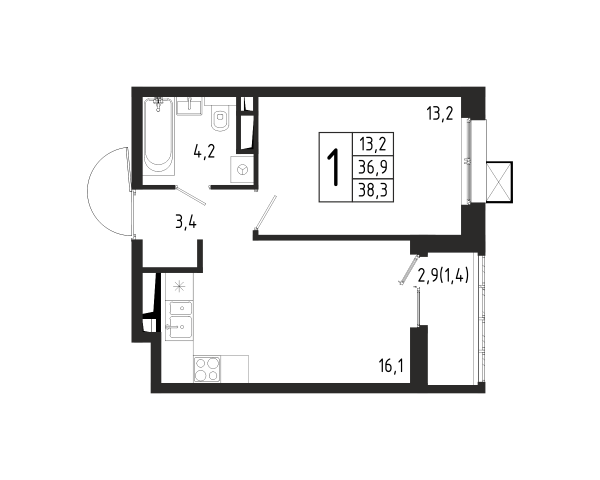 1 комната, 38.3 м², Этаж: 2/11, № 19