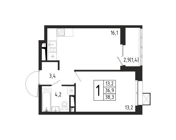 1 комната, 38.3 м², Этаж: 2/11, № 135