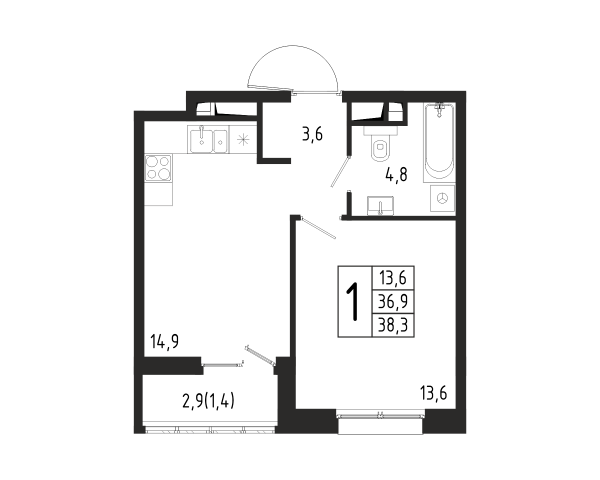 1 комната, 38.3 м², Этаж: 7/11, № 266
