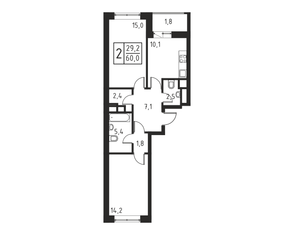 2 комнаты, 60.7 м², Этаж: 8/25, № 361