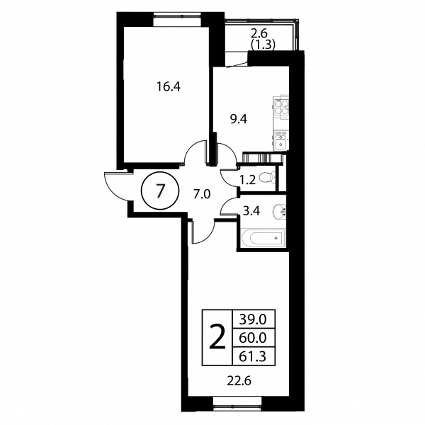 2 комнаты, 61.3 м², Этаж: 3/12, № 7