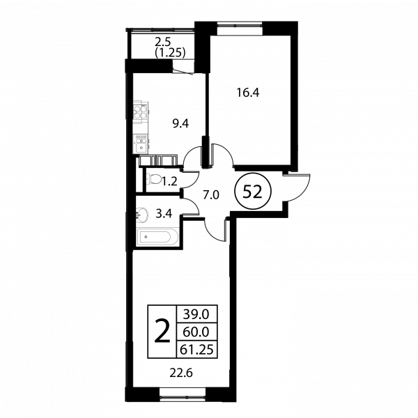 2 комнаты, 61.25 м², Этаж: 2/12, № 52
