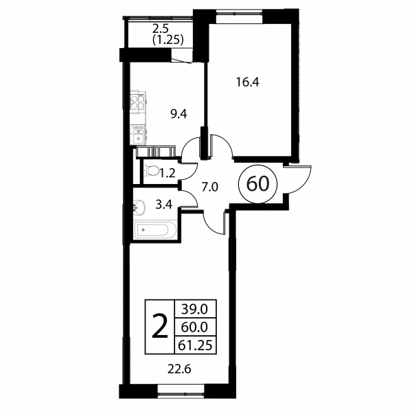 2 комнаты, 61.25 м², Этаж: 4/12, № 60