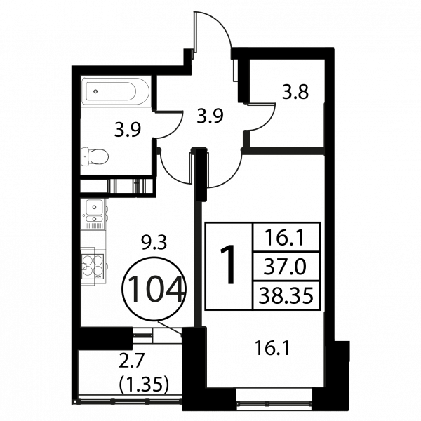 1 комната, 38.35 м², Этаж: 4/12, № 104