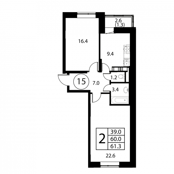 2 комнаты, 61.3 м², Этаж: 5/12, № 15