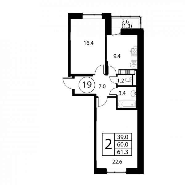 2 комнаты, 61.3 м², Этаж: 6/12, № 19