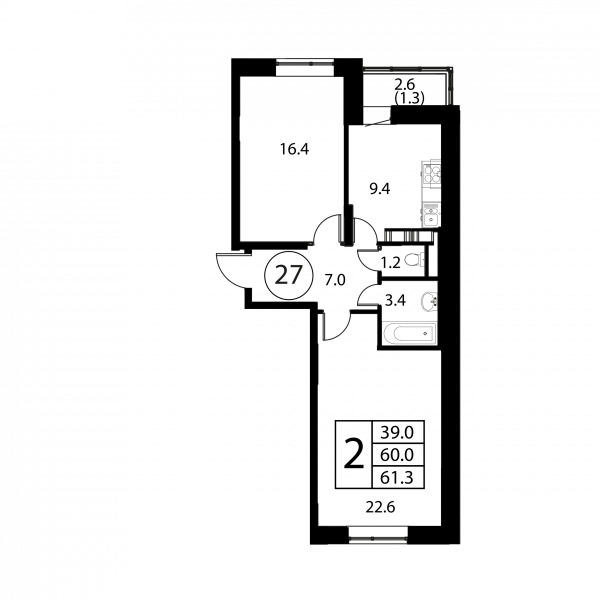 2 комнаты, 61.3 м², Этаж: 8/12, № 27