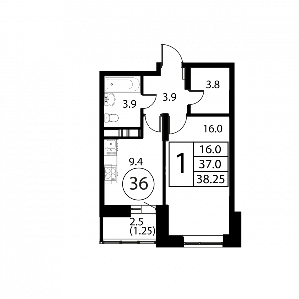 1 комната, 38.25 м², Этаж: 10/12, № 36