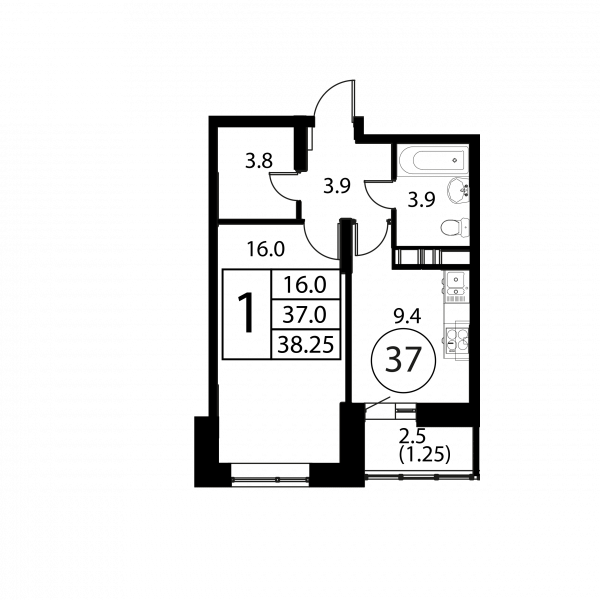 1 комната, 38.25 м², Этаж: 10/12, № 37