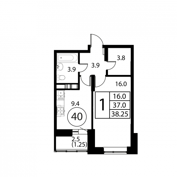 1 комната, 38.25 м², Этаж: 11/12, № 40