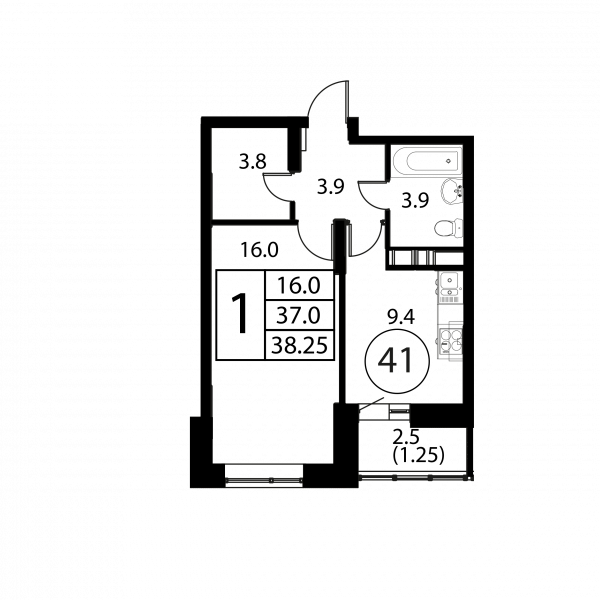 1 комната, 38.25 м², Этаж: 11/12, № 41