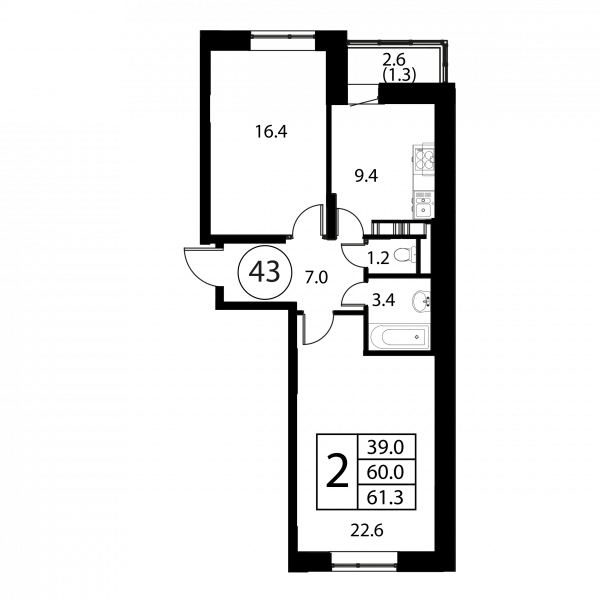 2 комнаты, 61.3 м², Этаж: 12/12, № 43