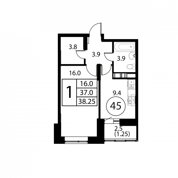 1 комната, 38.25 м², Этаж: 12/12, № 45