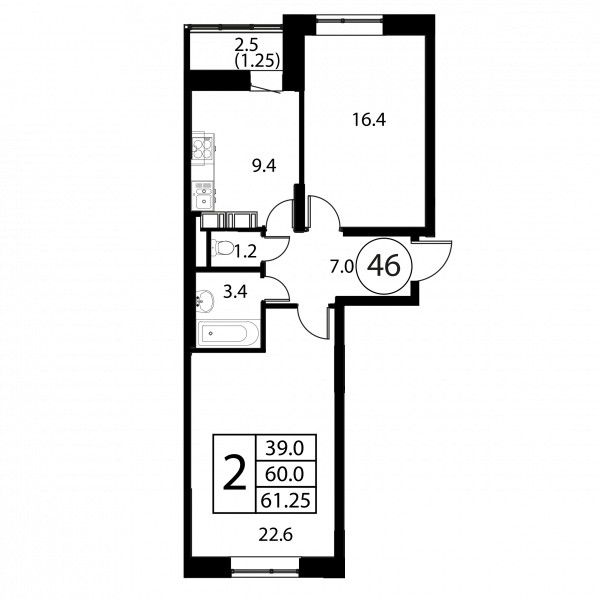2 комнаты, 61.25 м², Этаж: 12/12, № 46