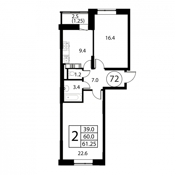 2 комнаты, 61.25 м², Этаж: 7/12, № 72