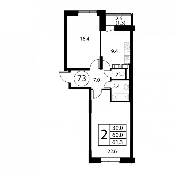 2 комнаты, 61.3 м², Этаж: 8/12, № 73
