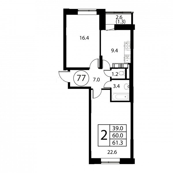 2 комнаты, 61.3 м², Этаж: 9/12, № 77