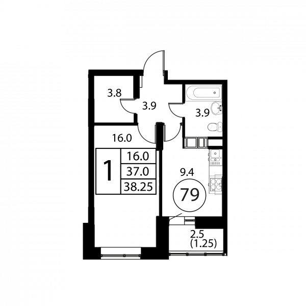 1 комната, 38.25 м², Этаж: 9/12, № 79