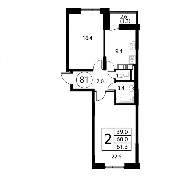 2 комнаты, 61.3 м², Этаж: 10/12, № 81