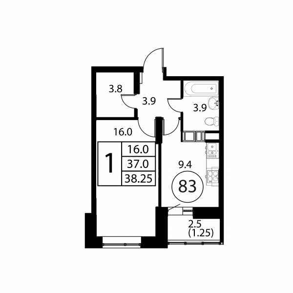 1 комната, 38.25 м², Этаж: 10/12, № 83