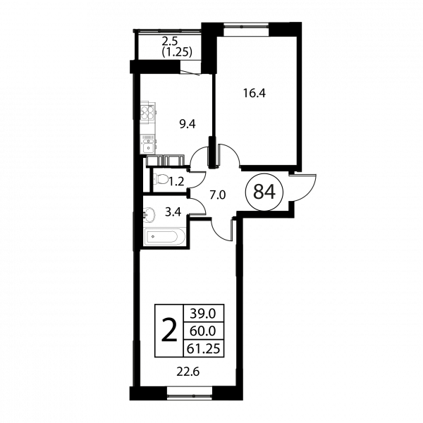 2 комнаты, 61.25 м², Этаж: 10/12, № 84