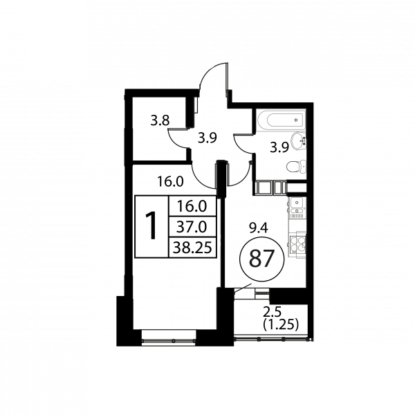 1 комната, 38.25 м², Этаж: 11/12, № 87