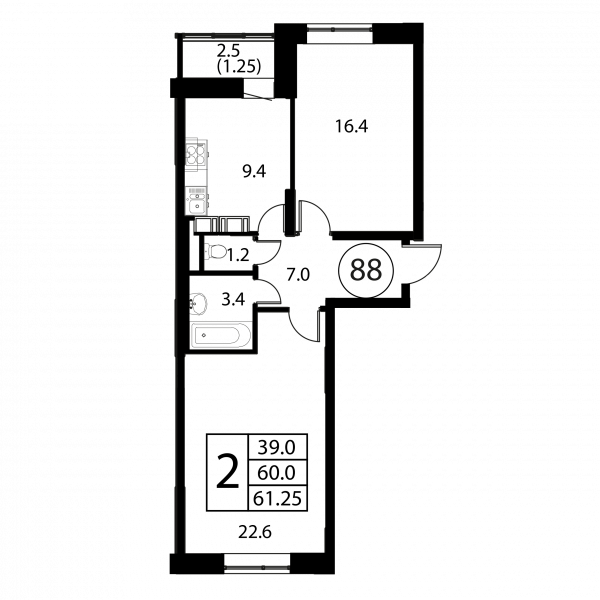 2 комнаты, 61.25 м², Этаж: 11/12, № 88