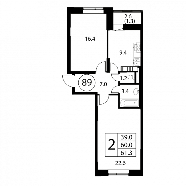 2 комнаты, 61.3 м², Этаж: 12/12, № 89