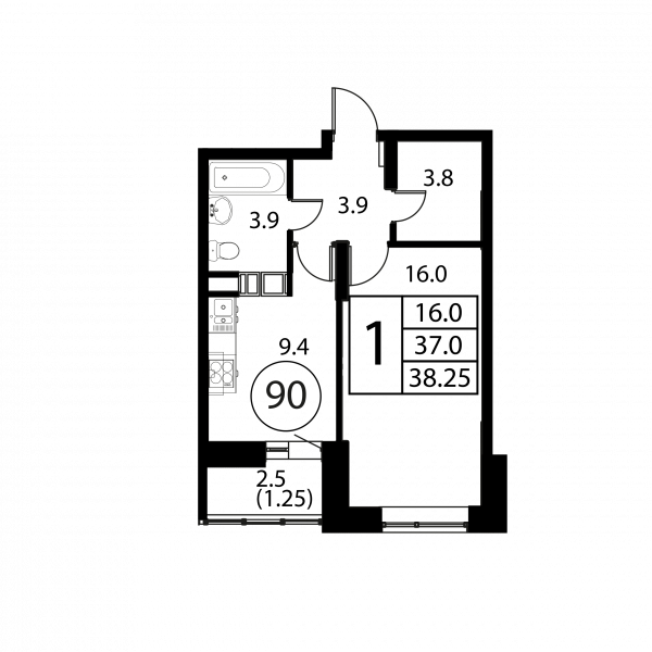 1 комната, 38.25 м², Этаж: 12/12, № 90