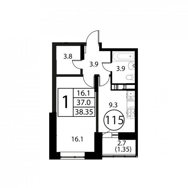 1 комната, 38.35 м², Этаж: 6/12, № 115