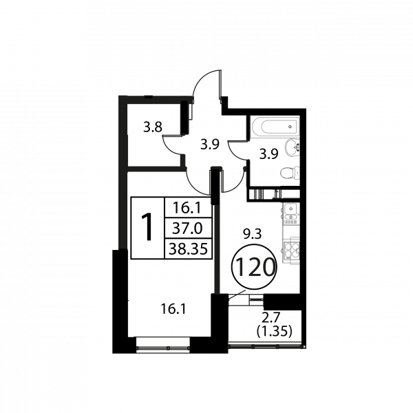 1 комната, 38.35 м², Этаж: 7/12, № 120