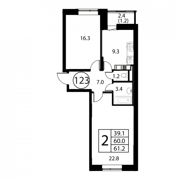2 комнаты, 61.2 м², Этаж: 8/12, № 123