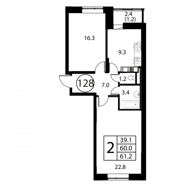 2 комнаты, 61.2 м², Этаж: 9/12, № 128