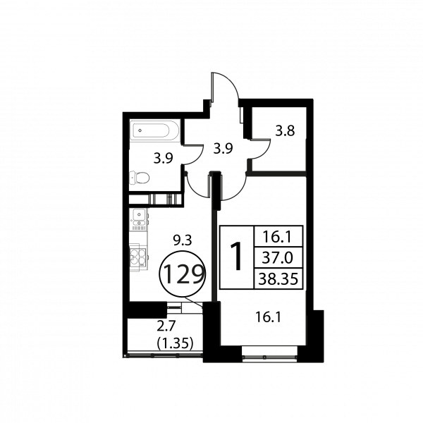 1 комната, 38.35 м², Этаж: 9/12, № 129