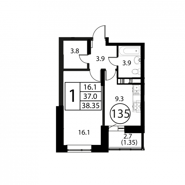 1 комната, 38.35 м², Этаж: 10/12, № 135