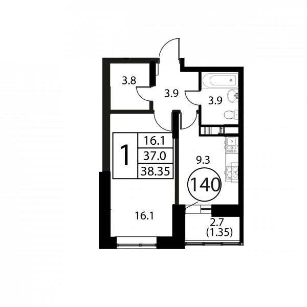 1 комната, 38.35 м², Этаж: 11/12, № 140