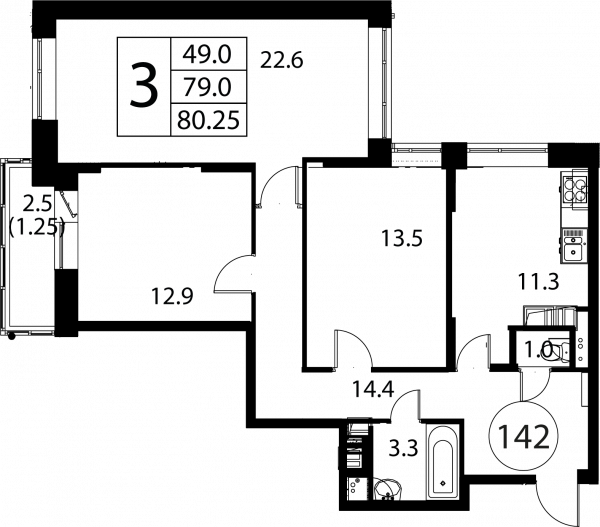 3 комнаты, 80.25 м², Этаж: 11/12, № 142
