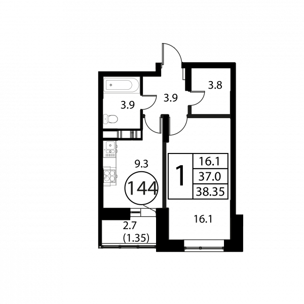 1 комната, 38.35 м², Этаж: 12/12, № 144