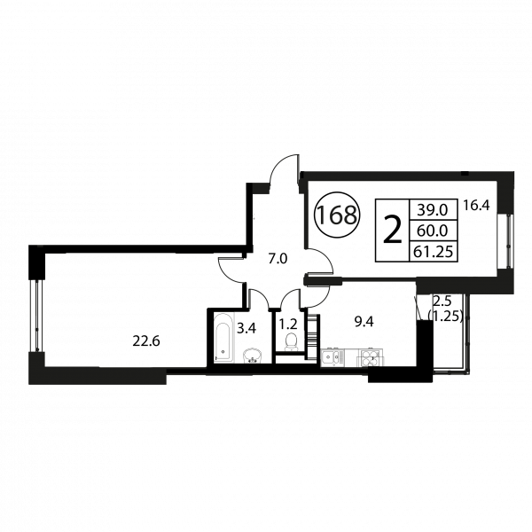 2 комнаты, 61.25 м², Этаж: 7/12, № 168