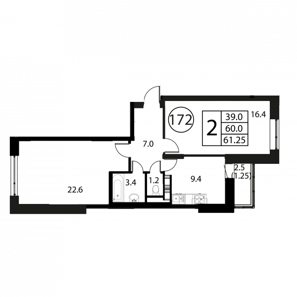 2 комнаты, 61.25 м², Этаж: 8/12, № 172
