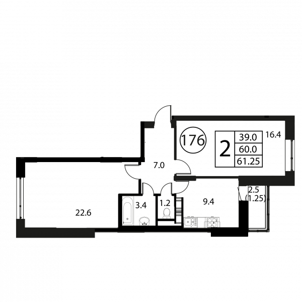 2 комнаты, 61.25 м², Этаж: 9/12, № 176