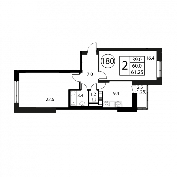 2 комнаты, 61.25 м², Этаж: 10/12, № 180