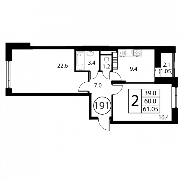2 комнаты, 61.05 м², Этаж: 12/12, № 191