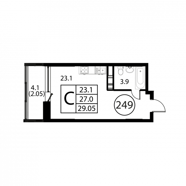 Студия, 29.05 м², Этаж: 9/12, № 249