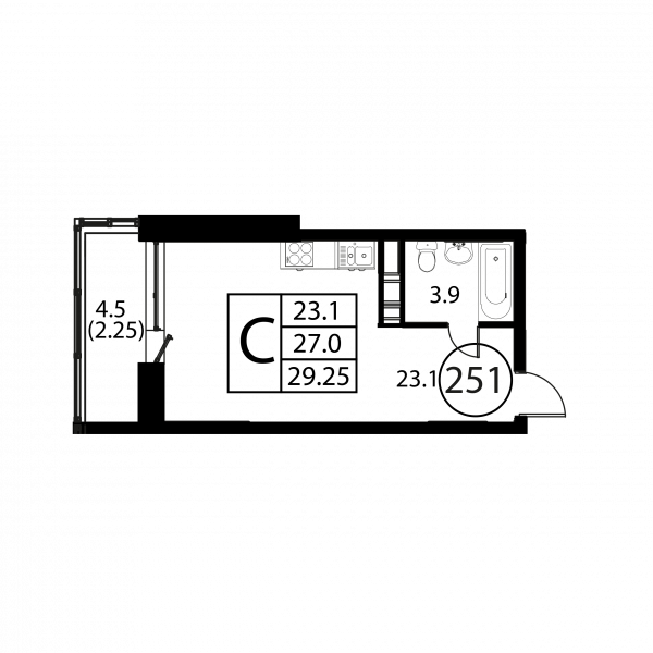 Студия, 29.25 м², Этаж: 9/12, № 251
