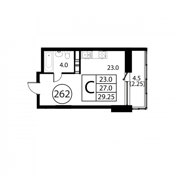 Студия, 29.25 м², Этаж: 11/12, № 262