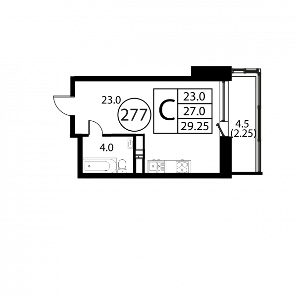 Студия, 29.25 м², Этаж: 12/12, № 277