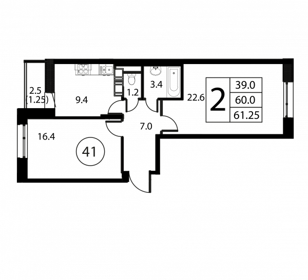 2 комнаты, 61.25 м², Этаж: 12/12, № 41