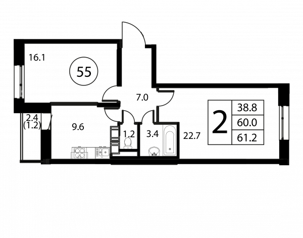 2 комнаты, 61.2 м², Этаж: 4/12, № 55
